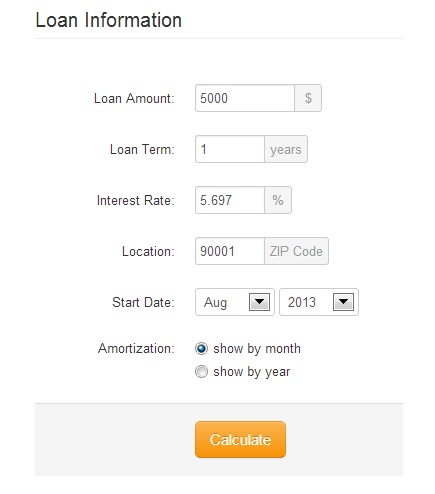 Example £5000 loan over 12 months, annual interest rate 5.697%, taken out 1-Jul-2013, first payment due 1-Aug-2013