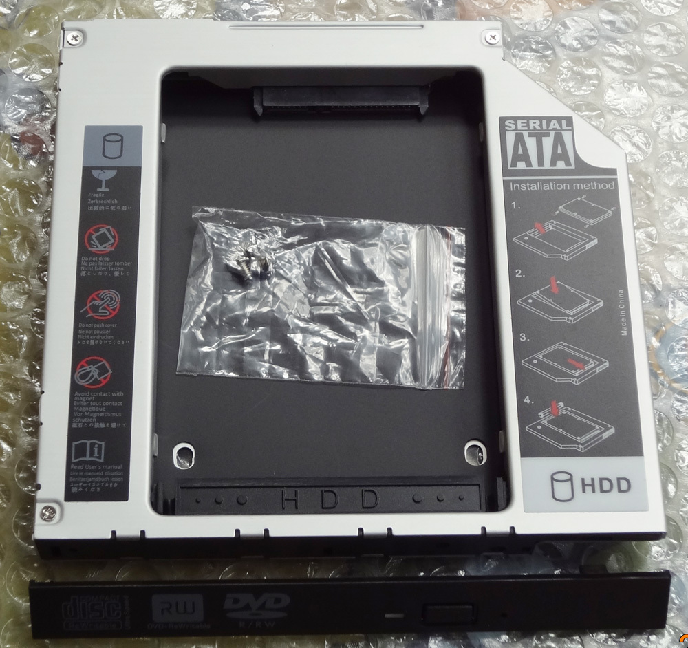 The upgrade that I did do was to replace the Optical/DVD drive with a caddy for a second hard drive (almost identical to the one in the picture). The caddy is 12.5mm and they can be purchased from ebay – eg “odd hard drive caddy”. The “kit” came with a small screwdriver to fit the hard drive into the caddy, screws for which form part of the caddy. The caddy is fitted into the laptop where the DVD drive goes, there’s just one screw securing it on the underside of the laptop, marked I think “ODD”.
