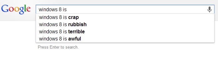 Just a note…I’m quite certain the Google search suggestions are not literal results…they are Google taking a stab at Microsoft. In every other case, when I start searching, and there are recommendations in the list…search results show up. The moment you type “Windows 8 is”, all the search results disappear. Additionally, if you keep searching for that prefix, the various adjectives change. Just another Google joke, I figure. Personally, I’ve found Windows 8 to be very likable…I think it is simply that it is different. Everyone wants a more modern OS, and yet no one ever likes change…. (I feel rather sad for such people…always stuck between the old and the new with no place to go.)