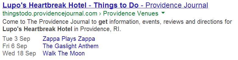 Another way to gain space on Google results is to use the Data Highlighter in Google Webmaster Tools. Lupo’s Heartbreak Hotel has 7 lines on Google: