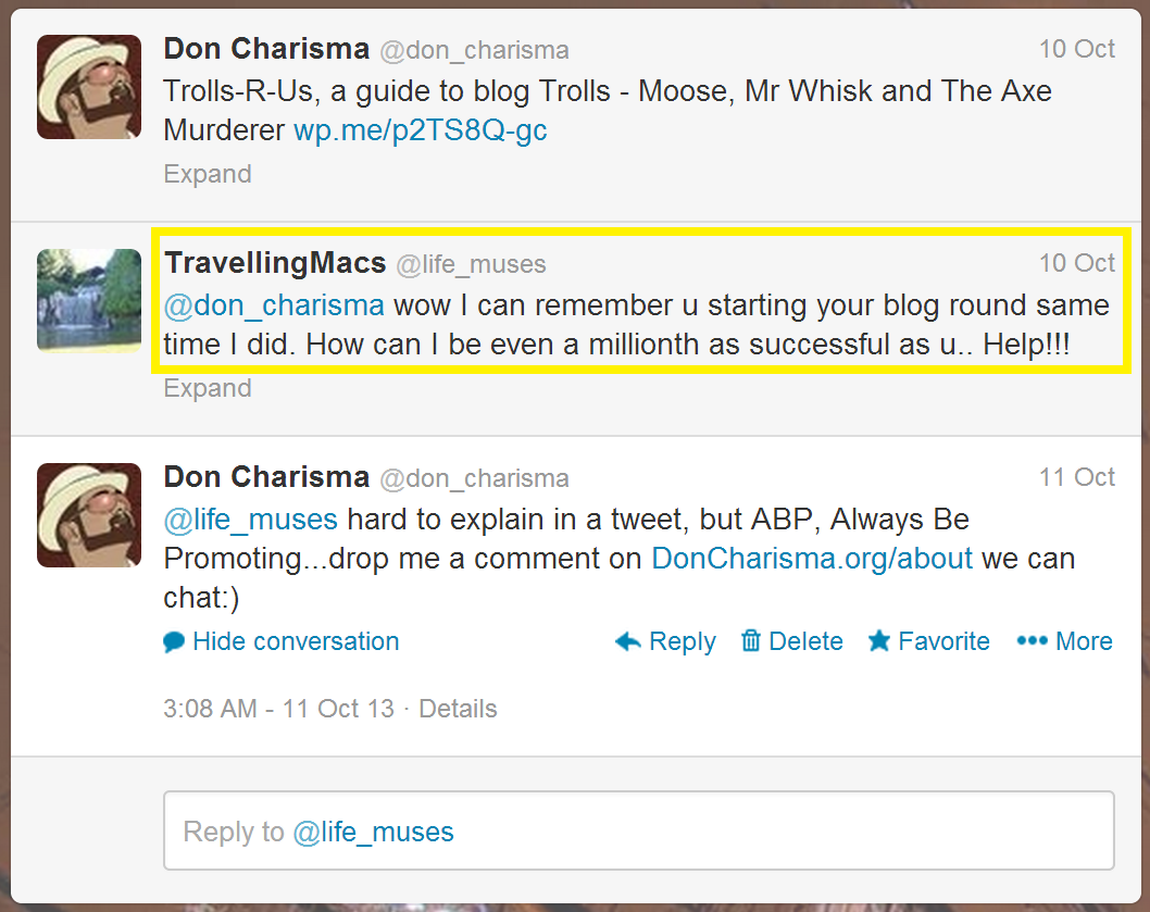 Of course make this natural, no one likes the pushy salesman or saleswoman, who is craving over dipping his or her needy little hand into your pocket, that’s just creepy isn’t it? What I mean is do it slowly, patiently, persistently, put passion and enthusiasm into it. People will start asking you about what you’re doing naturally. Take a look at this tweet that TravellingMacs sent me :