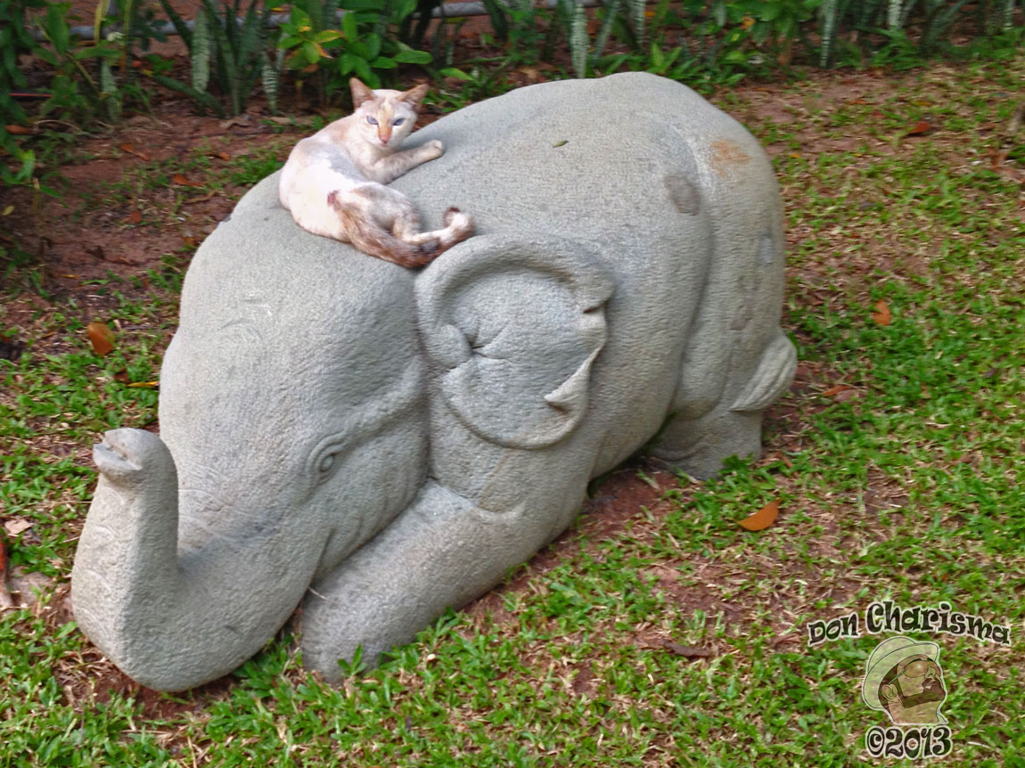 This little cat was sound asleep snoozing in the early evening heat on the little cup on the top of the baby elephant’s head. That is until I tried to take her picture. And no she wasn’t going to let me get a close-up ! Was a much better photo with her asleep … ah well never-mind:)