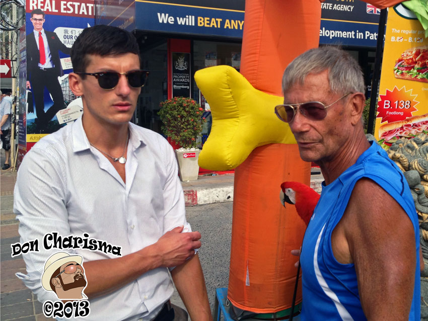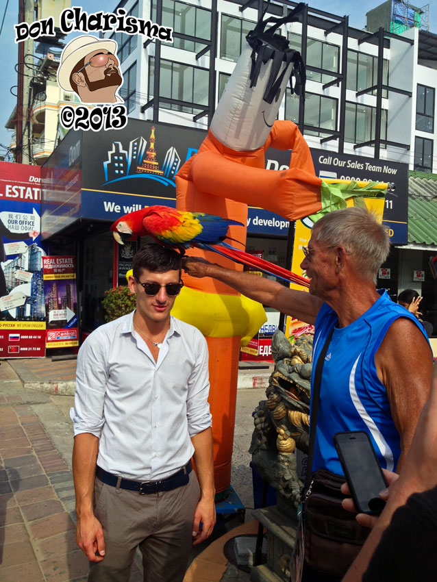 Love the parrot. He is such a beautiful bird. Funny how I imagined that the pimp was Thai but he looks as if he is European. There is no excuse for bad manners.