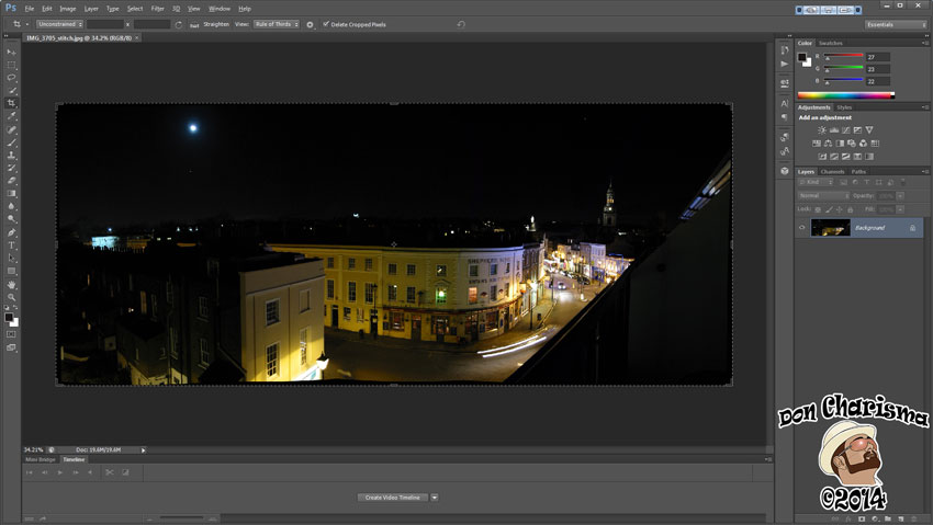 Pros – Free. One of the least fussy panorama/stitching applications I’ve used. It can also do parallel movement type stitching or the more traditional rotational stitching. It’s quick and doesn’t use a great deal of resources on the machine. Has the ability to shift the center of the panorama and straighten horizon – big feature, you’ll see why later with Photoshop.