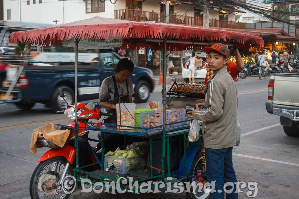 Street food off of a moped and sidecar, typical of Thailand … everything from shoes, to ice cream, to dresses, to curries, to sunglasses etc etc etc sold off of these mobile commerce vehicles.