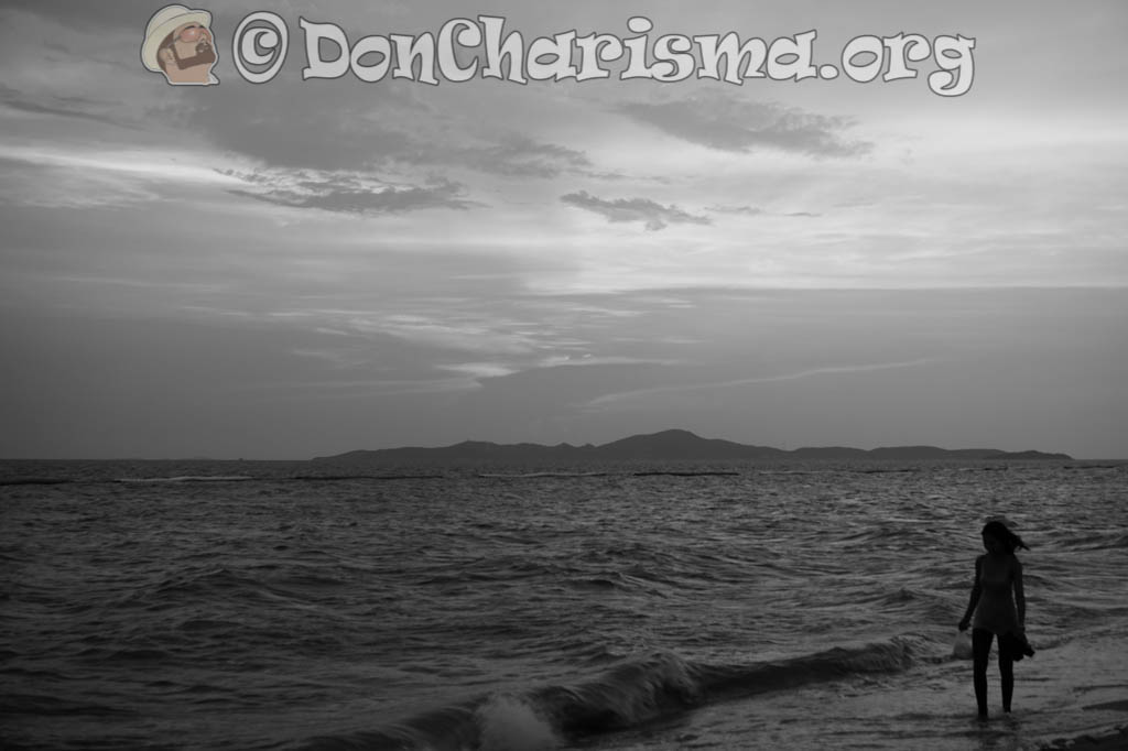 this capture of a moody ocean sunset with a woman walking the waves subtly improves with B&W …